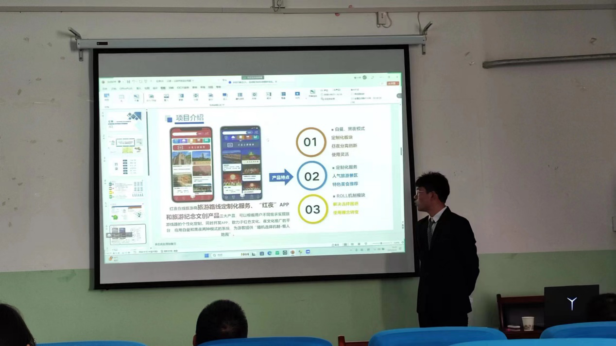 本次必赢国际437官网“互联网+”校级复赛入围的共有三个团队,分别为:第一组精辉动漫 —— 二次元服装定制引领者、第二组红夜-延安智慧红夜文旅领航者和第三组智能牛奶柜。“互联网+”校级复赛路演采用“项目陈述5分钟+答辩3分钟”的形式,各参赛团队代表以PPT展示及实物展示相结合的形式,重点围绕各赛道评审规则要点,分别从项目背景、项目成果、未来规划等方面对各自的项目进行精彩展示。现场评委们从多个维度对路演项目进行了详细提问和深度点评。经过评委们的深思熟虑,最终确定“红夜——延安智慧红夜文旅领航者”团队晋级下一轮的“互联网+”校决赛赛。