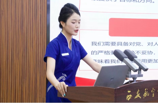本次学生团干部决赛分为微团课讲授和“我与支部共成长”主题分享。姜旭星同学以“以民航精神绘青春之底色”为主题,开展了一次微团课。她以生动的话语将主题分为四部分来分享,最后以向风而行,起落平安为结束语。