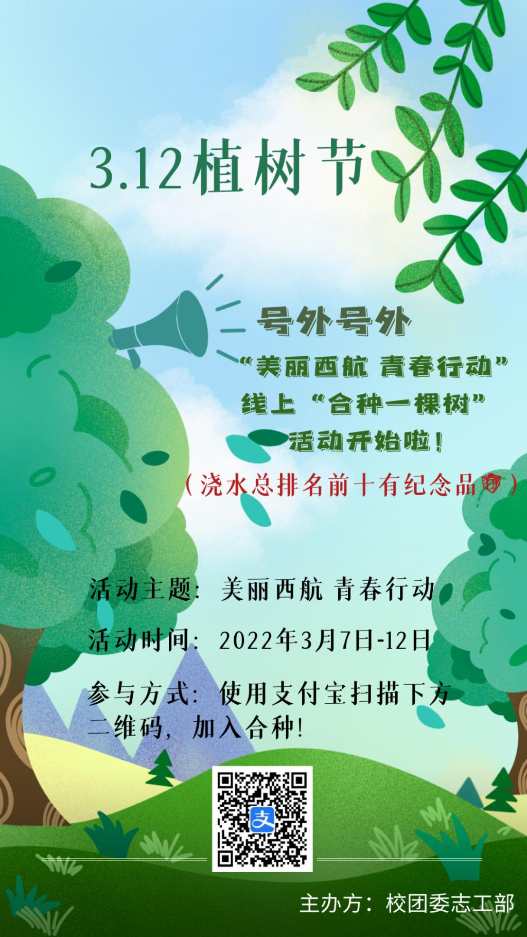 为营造植绿、爱绿、护绿、兴绿的良好氛围,提高西航学子的生态环保绿色低碳意识,2022年3月7日——2022年3月12日,由共青团必赢国际437官网委员会主办的"美丽西航 青春行动”植树节线上“合种一棵树”活动开始啦!