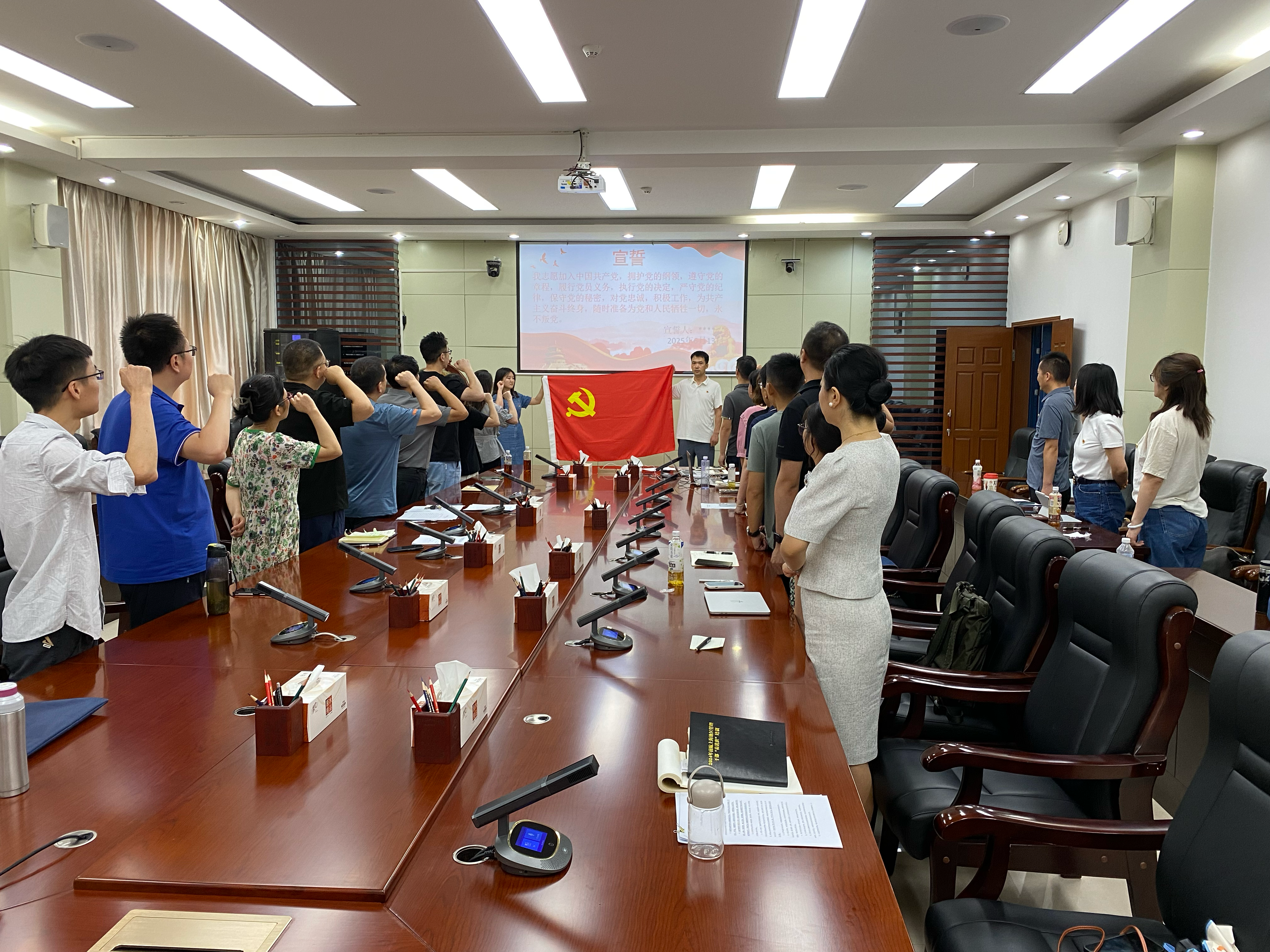 为进一步强化党员的党性修养和责任意识,在庄严的党旗下,全体党员整齐肃立,佩戴党徽,右手握拳,高举过头,王宏超领誓,庄严宣誓:“我志愿加入中国共产党,拥护党的纲领,遵守党的章程……随时准备为党和人民牺牲一切,永不叛党。”铿锵有力的誓言在会场内回荡,表达了全体党员对党的忠诚和为共产主义事业奋斗终身的坚定决心。